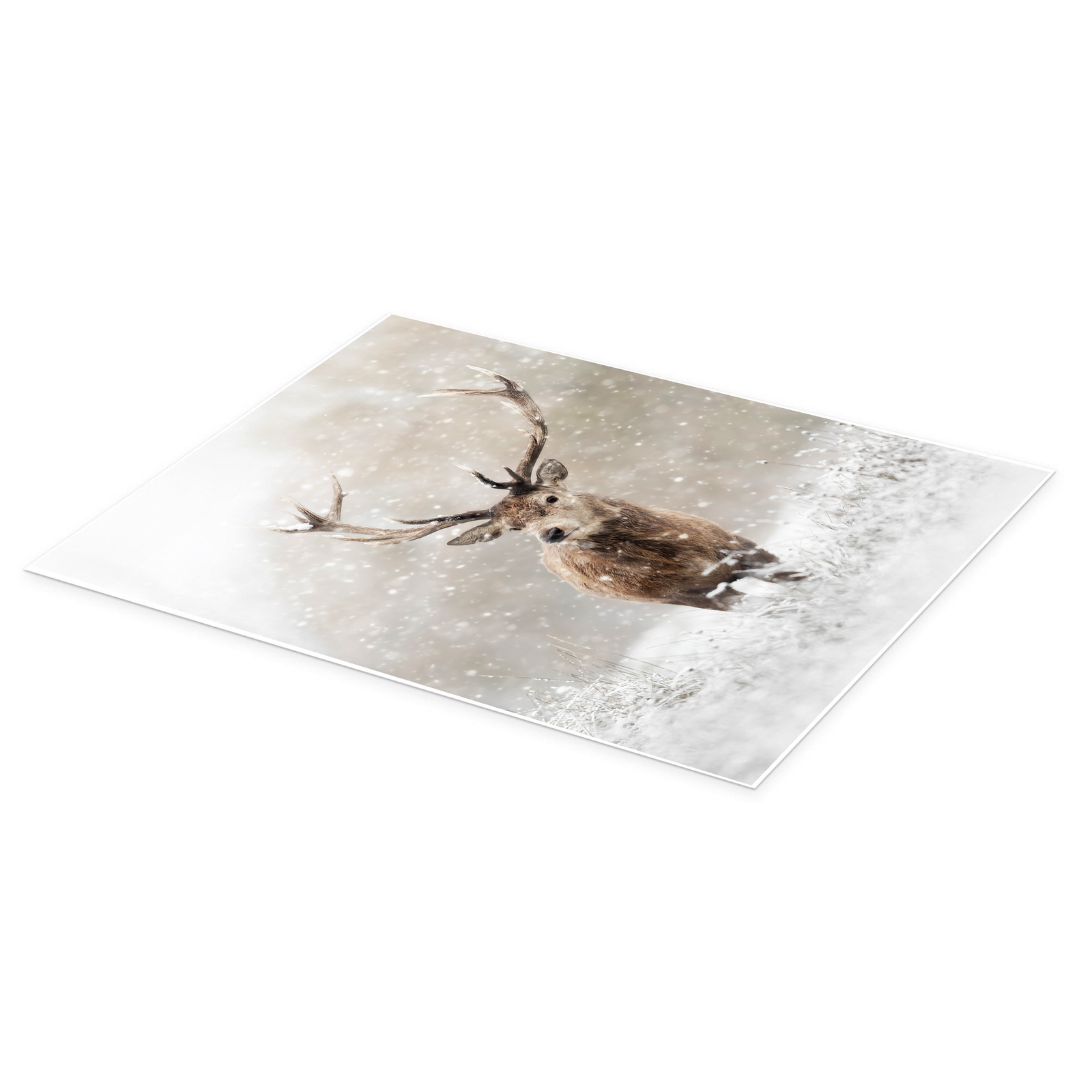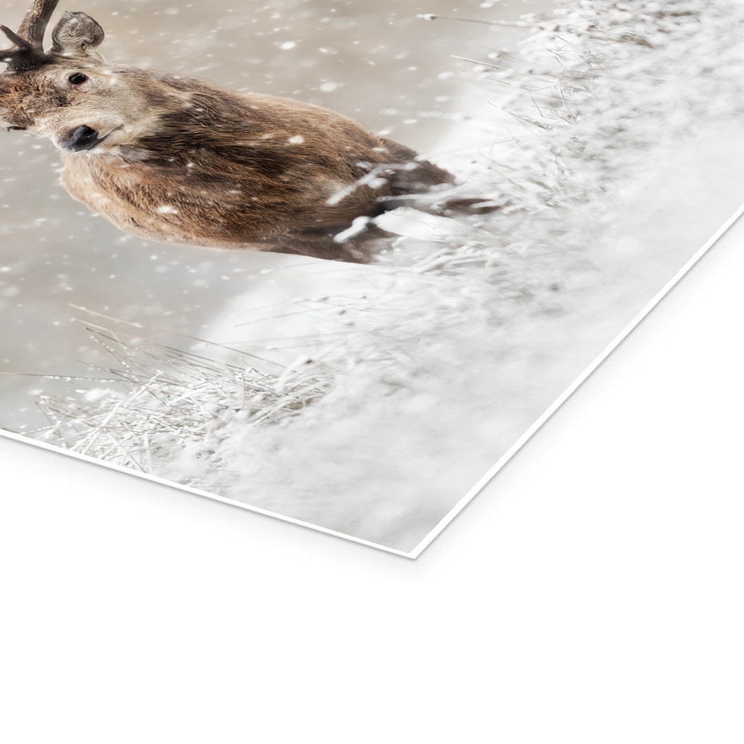 Step into a hushed winter wonderland with “Winter Monarch.” This breathtaking artwork captures the quiet majesty of a red deer stag as he moves silently through a falling snow. It is a moment of pure peace and natural nobility, evoking the stillness of the forest and the enduring beauty of wildlife in its element.