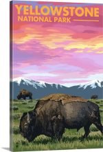 Inspired by the golden age of travel and the classic WPA posters, this piece utilizes a bold, graphic illustration style. The artist skillfully renders the scene with clean lines and stylized color blocks, from the powerful forms of the grazing bison to the rugged, snow-dusted peaks in the distance. The elegant, prominent typography completes the nostalgic aesthetic, evoking a sense of adventure and wanderlust.